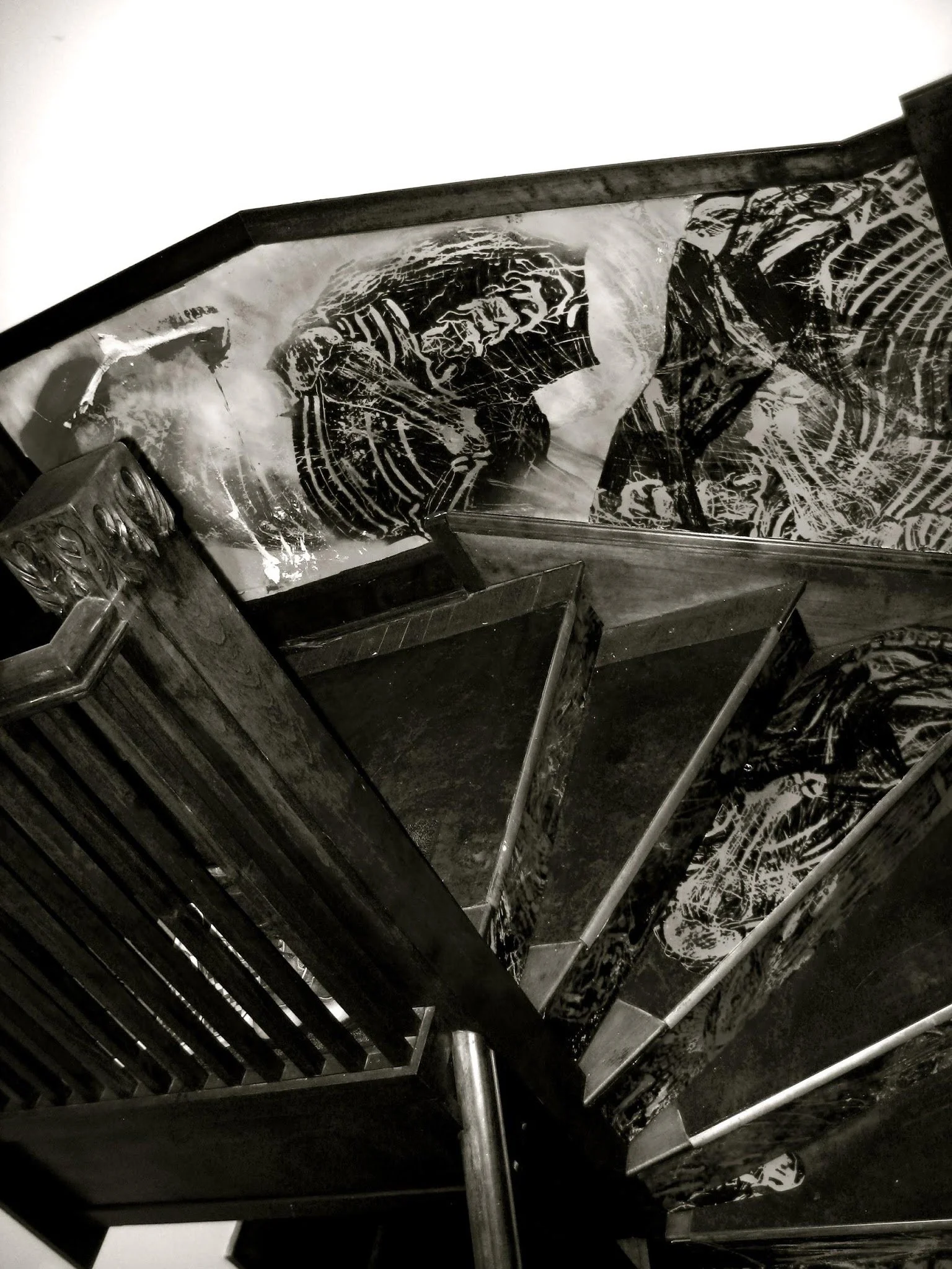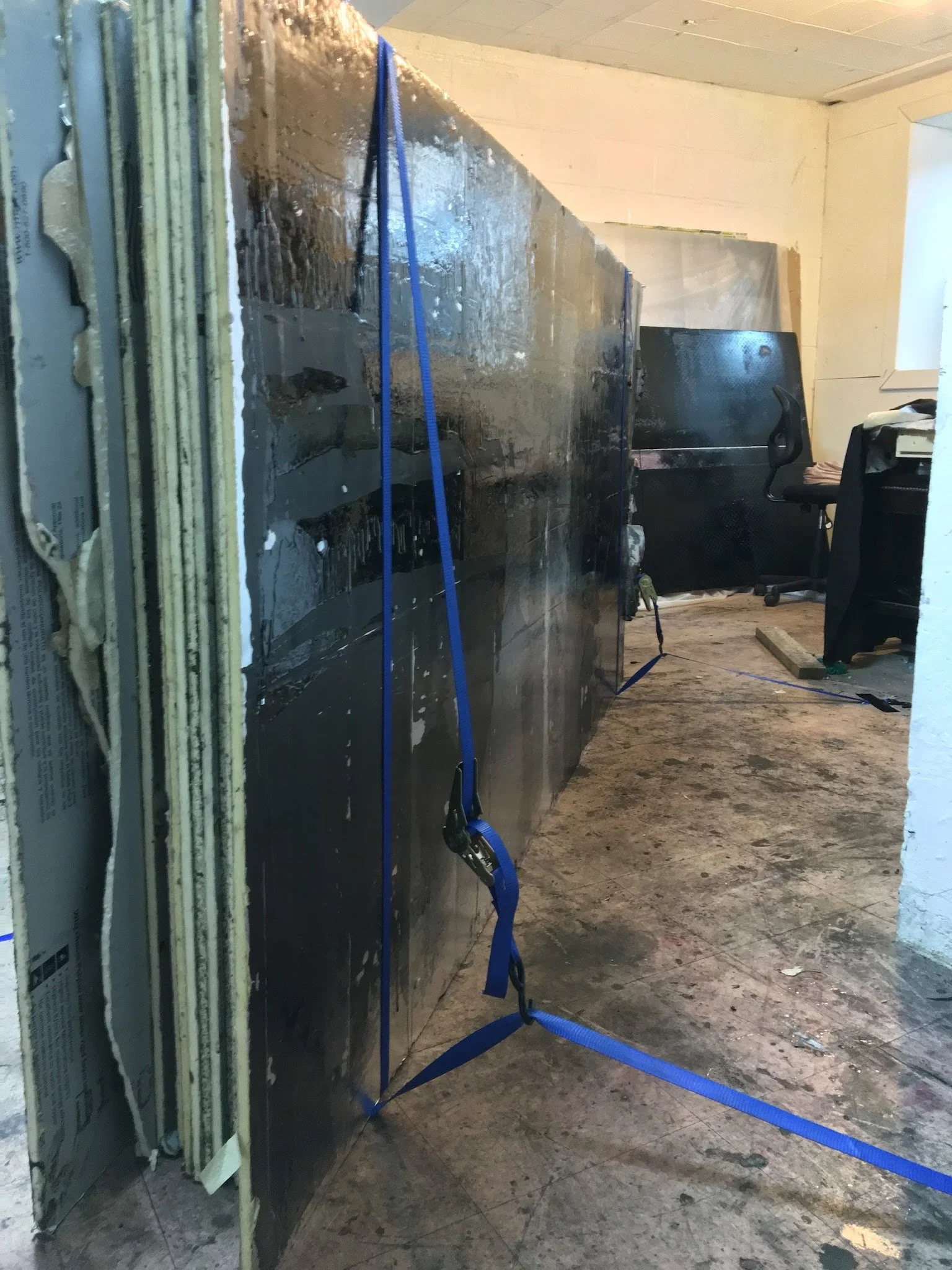 Liquid tar encapsulated in vinyl, moveable gallery wall, step ladder
