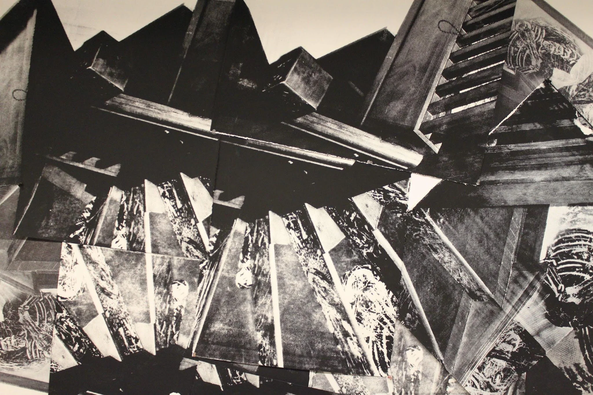 Foreground : Liquid tar encapsulated in vinyl, gallery pedestal, found object (lamp shade)   Background : Acrylic paint, powdered toner, graphite, cement-board